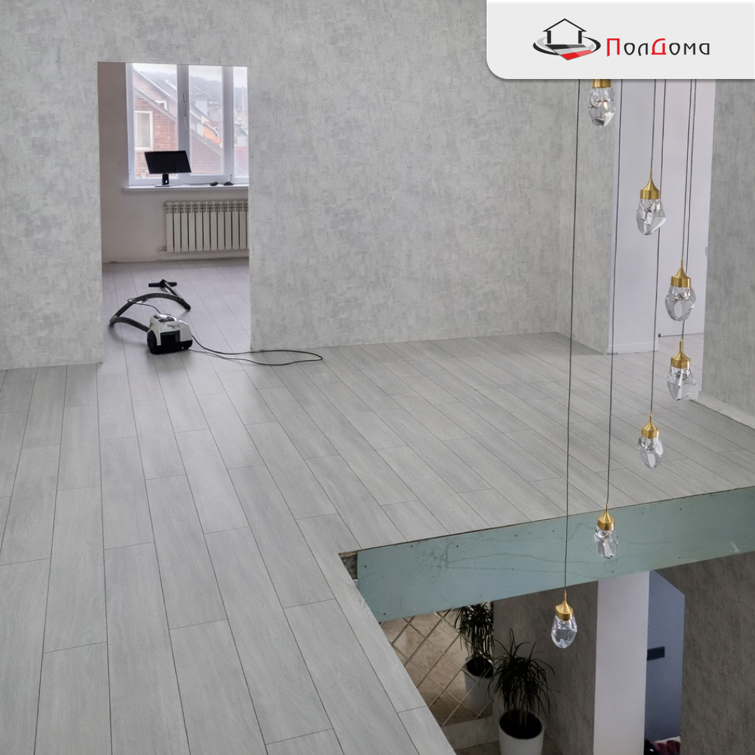 Ключ к успеху — в подготовке. Основанием послужила фанера, что обеспечило идеально ровный и стабильный «фундамент». Клиент выбрал классическую прямую схему укладки, которая не только визуально расширяет пространство, но и является самой экономичной в плане расхода материала. Четкая геометрия плит и продуманная замковая система коллекции CM Floor ScandiWood 02 позволили провести монтаж быстро и без лишних сложностей — будто собирал огромный, очень красивый пазл.