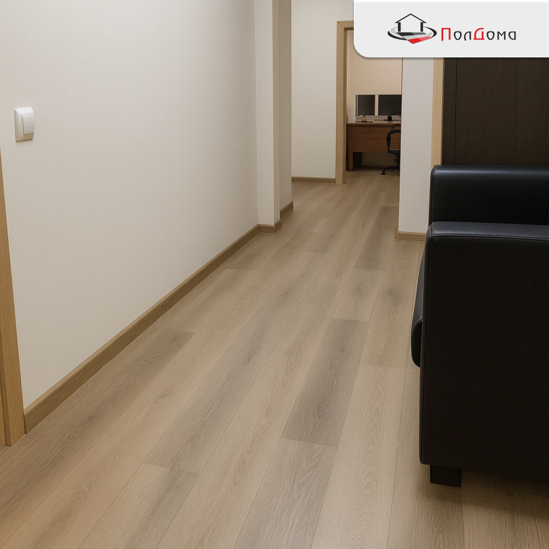 Для покрытия выбрана клеевая LVT Alpine Floor Grand Sequoia толщиной 2,5 мм — коллекция с выразительной «деревянной» фактурой, устойчивостью к истиранию и стабильной геометрией. По периметру смонтирован плинтус Arbiton Indo 11 для аккуратного примыкания к стенам и завершённого вида интерьера.