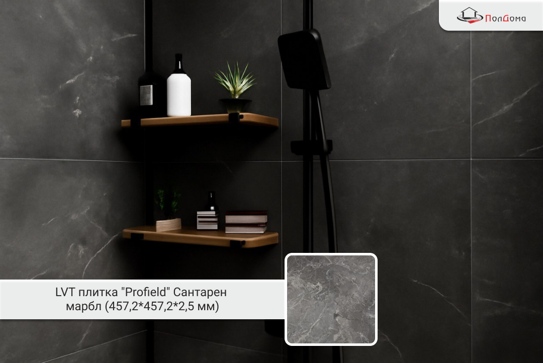 Для стен использовалась плитка LVT "Profiled" Сантарен Марбл (457,2 × 457,2 × 2,5 мм). Эта плитка сочетает в себе прочность и долговечность, что делает её идеальным решением для ванных и санузлов. Она устойчива к влаге, ударам и деформациям, а её структура не скрипит со временем, что делает эксплуатацию ещё более комфортной. Для пола выбрана LVT плитка "Profield" Гуарда марбл (457,2*457,2*2,5 мм). Это покрытие сочетает в себе преимущества ламината и линолеума. Она устойчива к влаге, ударам и другим механическим воздействиям.